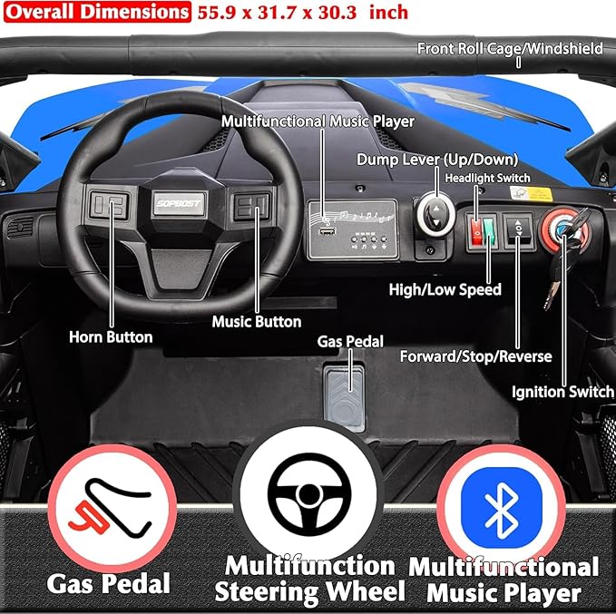 • Kids’ UTV with 1.4 Cu.Ft Dump Bed: The dump bed of this kids’ UTV is electric, kids can lift and down the dump bed by operating the joystick and handle, and it comes with a plastic shovel, your little kids can enjoy a transport experience with this side-by-side UTV. And the multifunctional music panel provides built-in music and devices connection functions (AUX/USB interface and wireless connection), enhances entertainments of this kids' toy car.