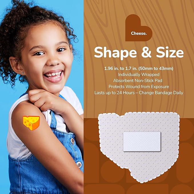 • EASY TO CARRY AND USE: These cute and colorful Cheese children's bandages are easy to take with you for travel, and easy to store in a home first aid kit; these healing bandages are perfect for school, summer camp, camping trips, weekend getaways and more