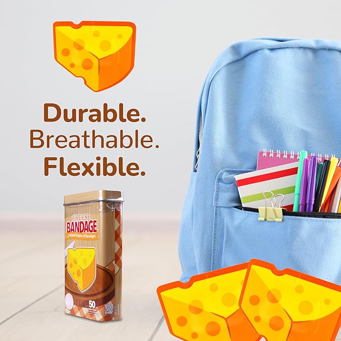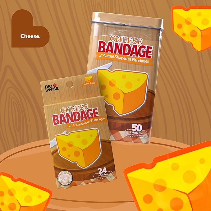 • CHEESE BANDAGES: This 50 piece tin of Cheese shaped bandages is great for putting a smile on kids' faces while protecting wounds such as cuts, scrapes, and burns; sticky bandages come in a cute tin and are perfect for kids and adults alike, and also for school nurses and pediatric doctors