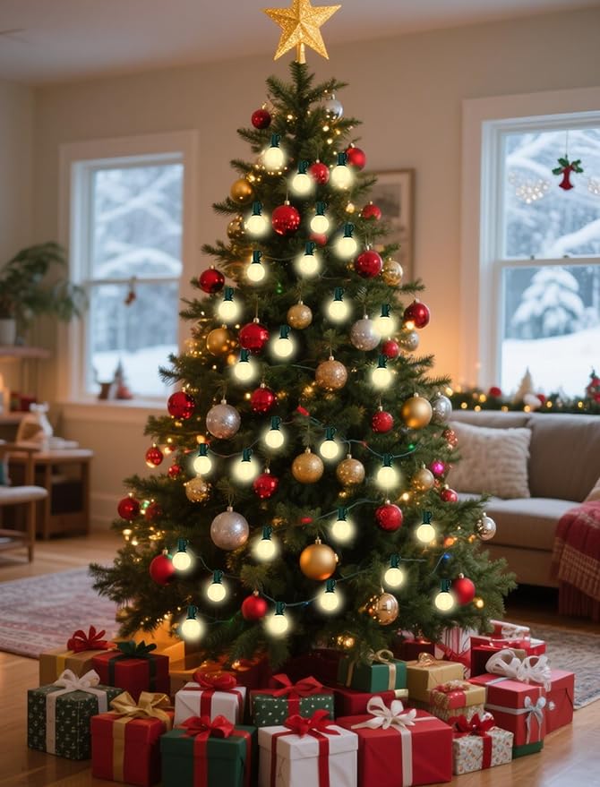 • Easy to Install & Versatile Use: Outdoor christmas string lights socket has a clip on the side. Simply hang or wrap round Christmas decorations bistro lights along rooflines, fences, trees, stair railings or patios. Hanging patio lights perfect for Christmas decorations, wedding receptions, garden parties, or cozy indoor setups, to transform your space into a warm, festive atmosphere.