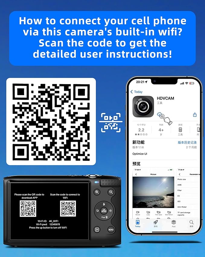 • ๐Ÿ“ถWifi Connection for Phone: This Digital Camera Has Built-in Wifi Function - which easily link your phone to your camera. You can preview, shoot, download and share photos /videos inside the camera from your phone directly. How to connect your cell phone via this cameraโ€™s built-in wifi? Please check the image on the detail page, there is a QR code with detailed user instructions.