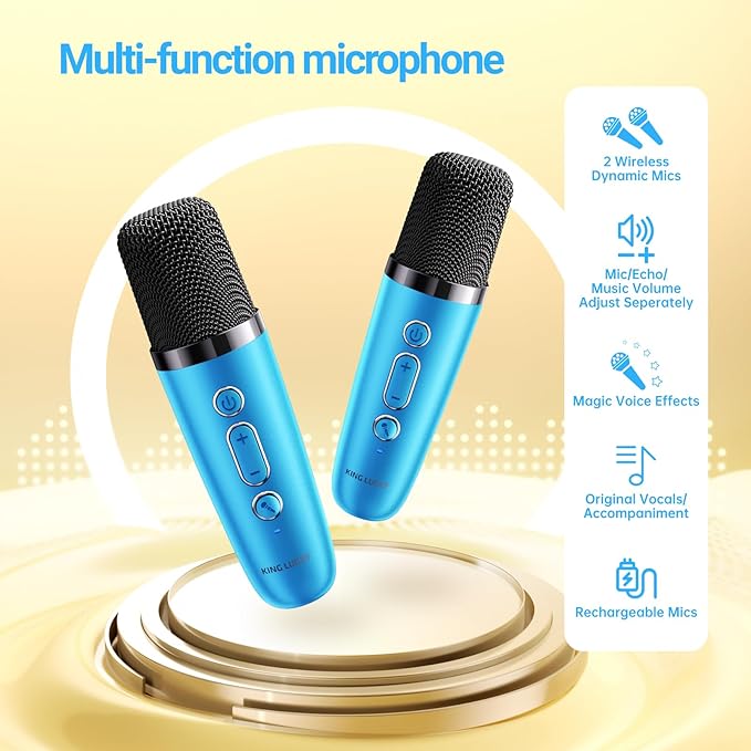• Premium Sound with 2 Wireless Microphones. Unlike low-cost karaoke machines with distorted audio, Kinglucky delivers clear, immersive sound with deep bass. Adjustable volume lets parents set a safe level so kids can sing freely without disturbing the household