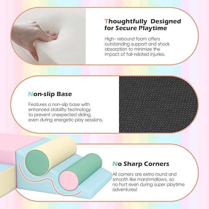 • Safety-First Soft Play Design: Crafted with premium high-density foam (ASTM certified), our climbing blocks stay sturdy yet gentle for active play. Rounded edges and seamless surfaces eliminate bump risks. Non-slip silicone grips on the base keep adventures stable and slip-free. ‌