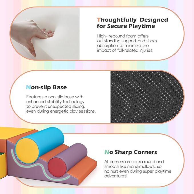• Safety-First Soft Play Design: Crafted with premium high-density foam (ASTM certified), our climbing blocks stay sturdy yet gentle for active play. Rounded edges and seamless surfaces eliminate bump risks. Non-slip silicone grips on the base keep adventures stable and slip-free. ‌