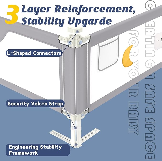• Additional stability support design: The 3-piece bed rail for baby comes with a headboard for additional support to enhance stability; Improper installation or a mismatched bed frame type can cause stability issues, so be sure to follow installation guidelines and measure your mattress size carefully to ensure compatibility; If you need help, our customer support team is on hand to provide practical advice and troubleshooting services