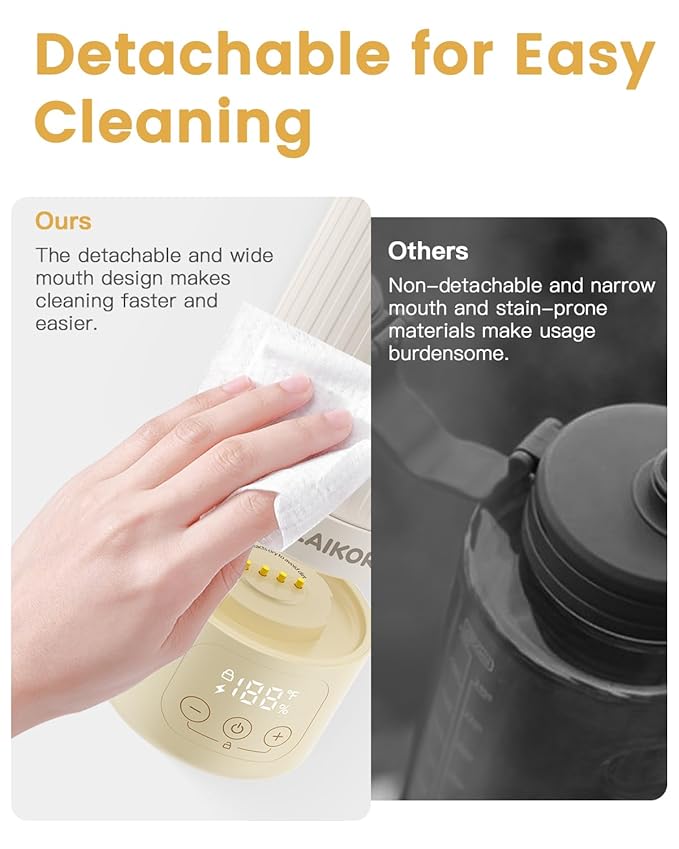 • 【Cordless & Rechargeable for Total Portability】This baby bottle warmer features a detachable 1000mAh battery, making it completely cordless and ideal for use anywhere—whether you're on a road trip, camping, or just out running errands.