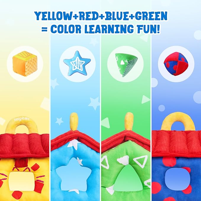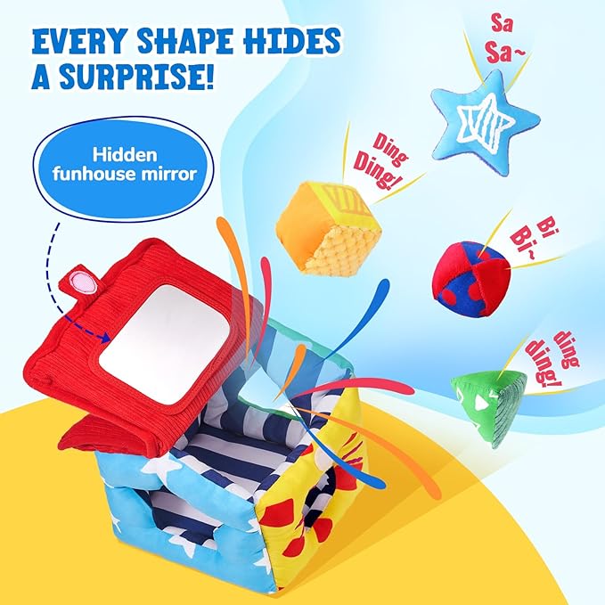 • All-in-1 Sensory Sorter: This soft fabric house includes 4 plush shapes, each with unique textures, sounds, and crinkles to stimulate touch, hearing, and curiosity. The Hide-and-seek roof hides a baby-safe mirror for self-discovery!