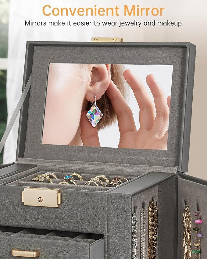 AKOZLIN 4-Tier Jewelry Box Leather Jewelry Storage Organizer with 3 Drawers Lockable for Women Girls Ring Necklace Earring Bracelet Holder with Mirror Dark Grey