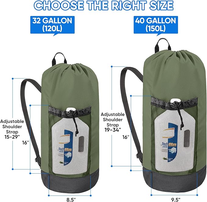 • 120L Large Laundry Bag: These travel laundry bags measure 29 "H X 13 "L with a large capacity of up to 120 L, enough for holding 2-3 batches of clothes; They also feature two front mesh wash pockets (16 "H X 8.5"L each), making your laundry backpack have space for storing detergent, shoes, and other essentials
