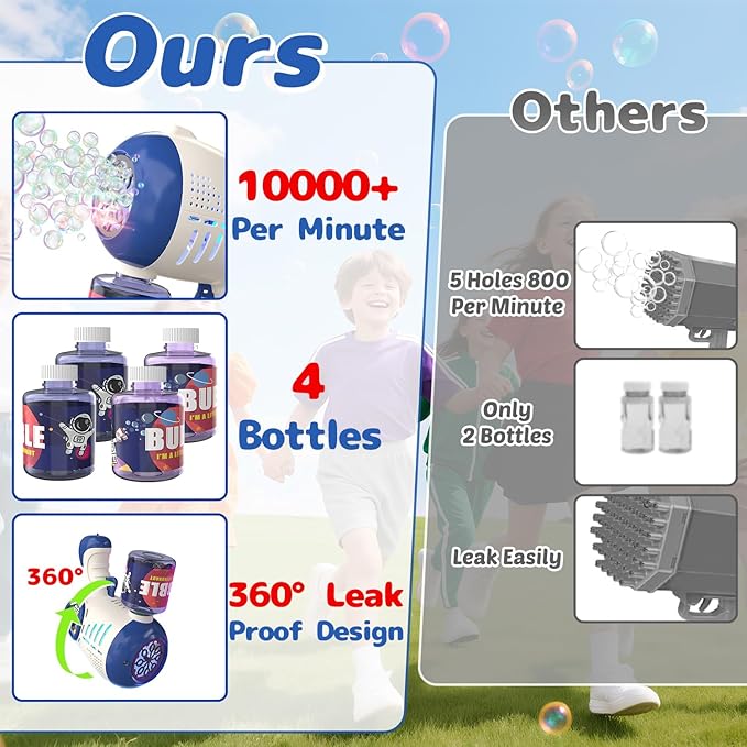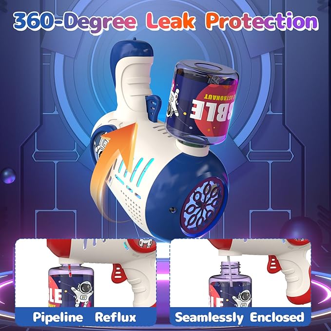 • MAGICAL LIGHT-UP DESIGN: Each bubble gun comes equipped with built-in LED lights, turning every bubble burst into a sparkling rainbow show. Watch your child's face light up as glowing bubbles fill the air—perfect for evening fun or festive celebrations