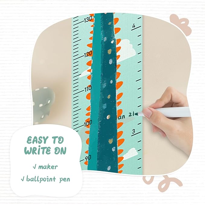 • Design: Kids growth chart with rope at the top of the chart, easy to install and removeable, foldable and portable design, easy to store, hang, roll up, transport, and save space. It boasts a material that's easy to write on, where you can use dark colored ballpoint pens and markers to track growth milestones. Our height ruler can clearly show your kids' height.