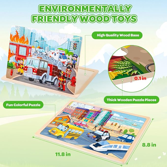 • Vehicles Toddler Puzzles - 6 pack 60pcs wooden Geography jigsaw puzzles for kids ages 3-5 years old. The wooden toys include Marine vehicles, Road vehicles, Fire and medical vehicles, Farm vehicles, Garbage trucks, and Engineering vehicles. Easy, funny, wonderful- educational Shape Puzzles toys develop hand-eye coordination, fine motor skills, and creative thinking.