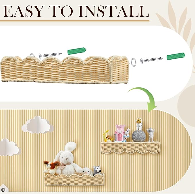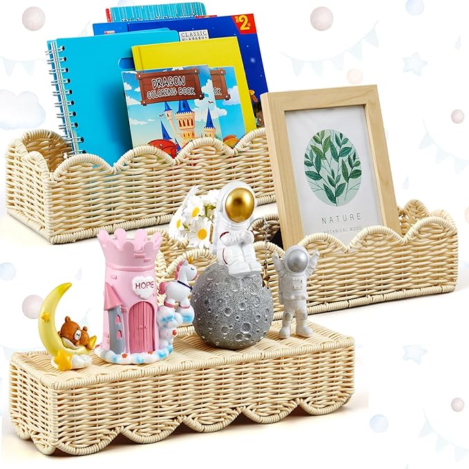 Pinkunn 3 Set Nursery Book Shelves Scalloped Rattan Wall Shelf 15.8 x 3.2 Inch Wall Mounted Plastic Floating Book Shelve, Hanging Boho Wicker Woven Shelf for Nursery Decor and Storage (Boho Beige)
