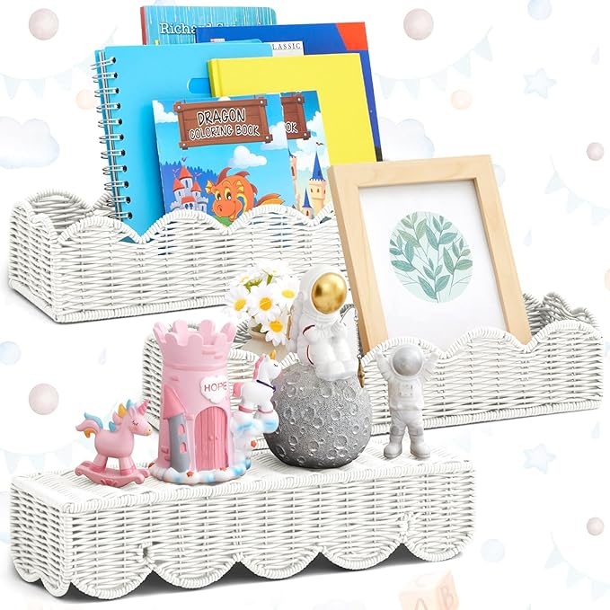 Pinkunn 3 Set Nursery Book Shelves Scalloped Rattan Wall Shelf 15.8 x 3.2 Inch Wall Mounted Plastic Floating Book Shelve, Hanging Boho Wicker Woven Shelf for Nursery Decor and Storage (Classic White)
