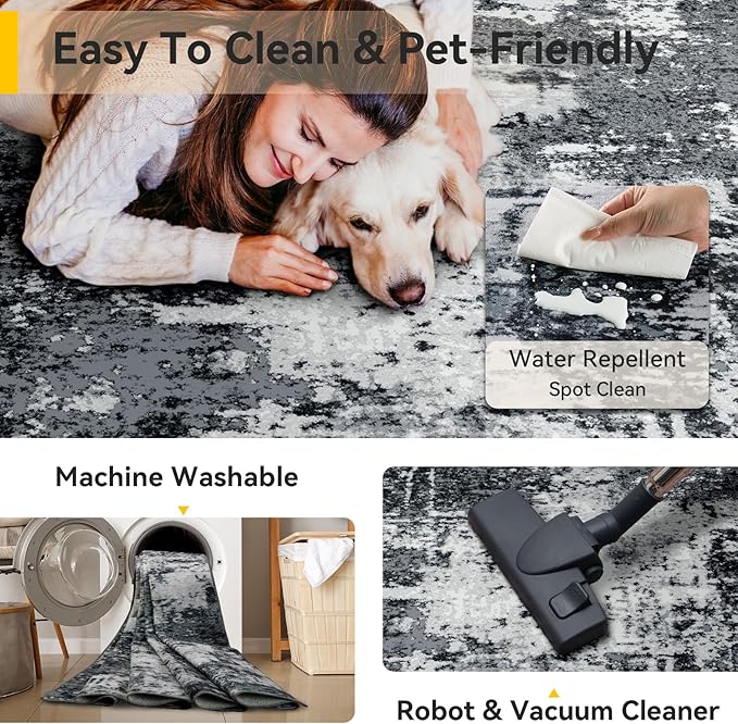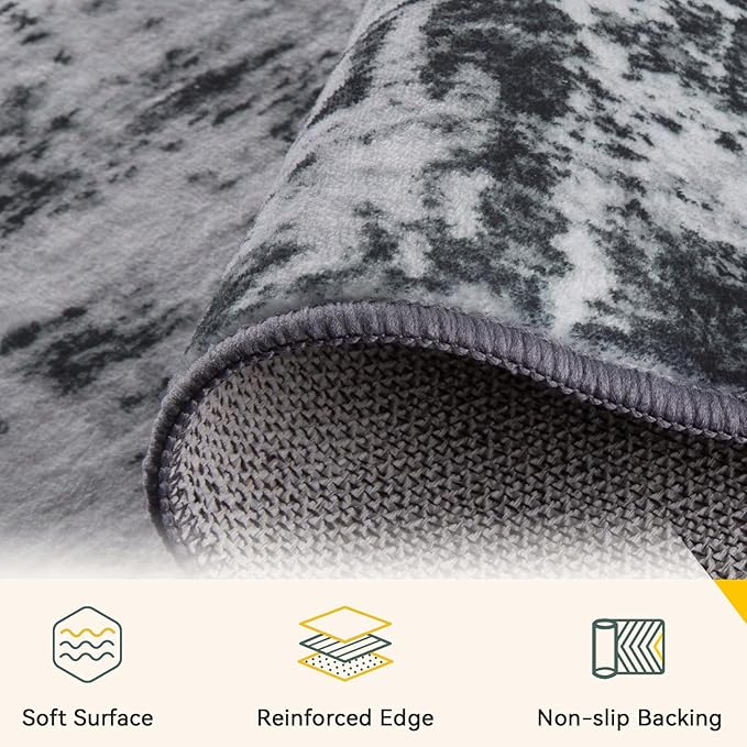 Washable Area Rugs 5'x7' Non-Slip Modern Abstract Soft for Living Room Entryway Bedroom Nursery, Print Pattern, Black Gray