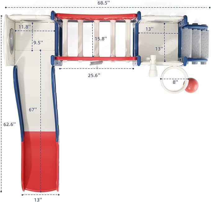 • 10-in-1 Play Features: Combines climbing bridge, slide, basketball hoop, hide-and-seek hole, play telescope, golf set, ring toss, climber stair, wavy bottom and storage – fostering active play and creativity.