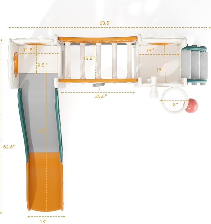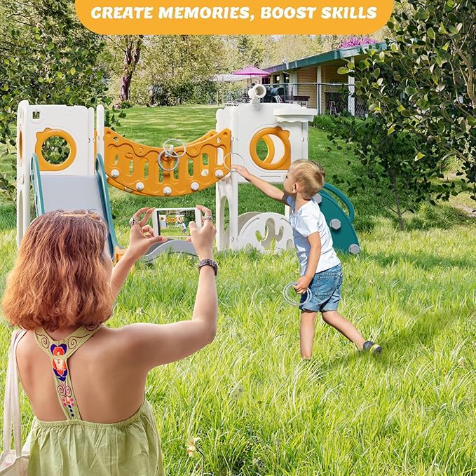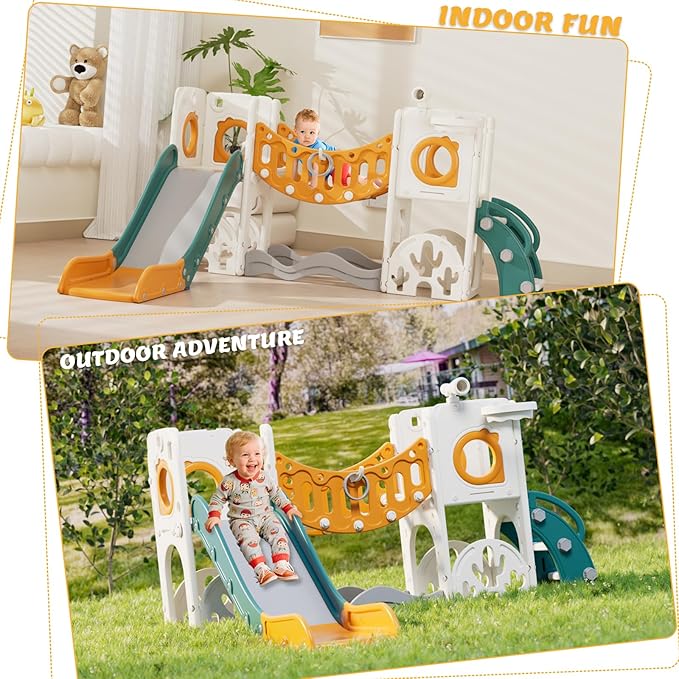 • 10-in-1 Play Features: Combines climbing bridge, slide, basketball hoop, hide-and-seek hole, play telescope, golf set, ring toss, climber stair, wavy bottom and storage – fostering active play and creativity.