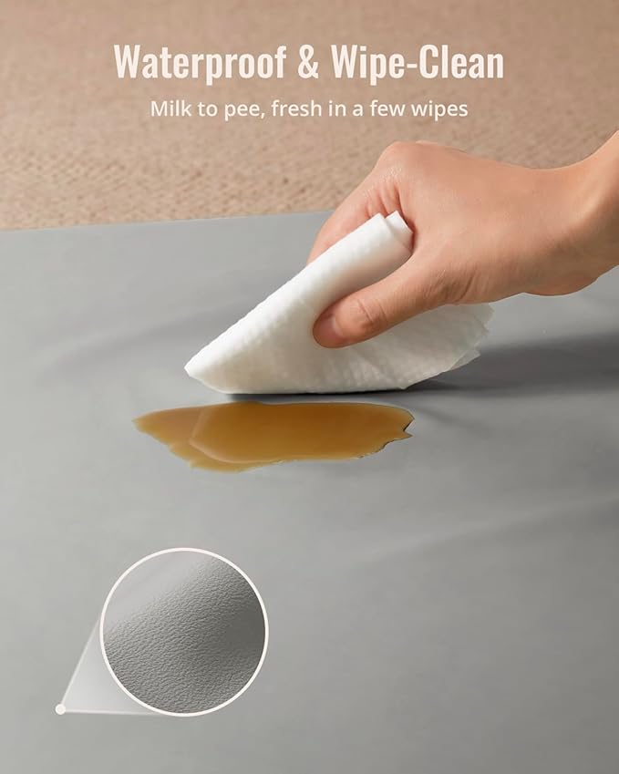 • Waterproof & Easy to Clean: Unlike many other mats that absorb spills, this Vegan leather baby play mat is 100% waterproof, making it effortless to clean. Just wipe it down with a damp cloth to remove food, milk spills, or any other mess, keeping your baby's play area spotless and hygienic