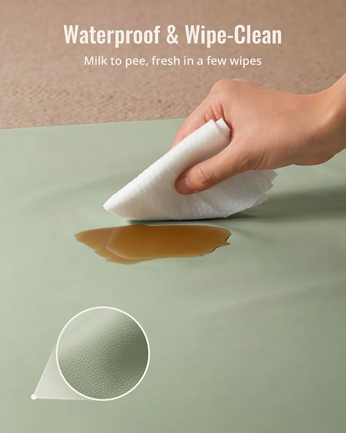 • Waterproof & Easy to Clean-Unlike many other mats that absorb spills, this vegan leather baby play mat is 100% waterproof, making it effortless to clean. Just wipe it down with a damp cloth to remove food, milk spills, or any other mess, keeping your baby’s play area spotless and hygienic