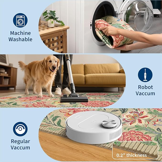 • 【floral Botanical Design】Inspired by floral fabrics, this botanical design features vivid, mirrored big floral motifs that attract the sweetest hummingbirds in a garden-like setting. Petals in bright yellow, lavender, pink, and red bloom beautifully against diffrent background. Water-resistant, stain-resistant, and machine-washable. Rug colors may vary slightly according to your device and the lighting in your space