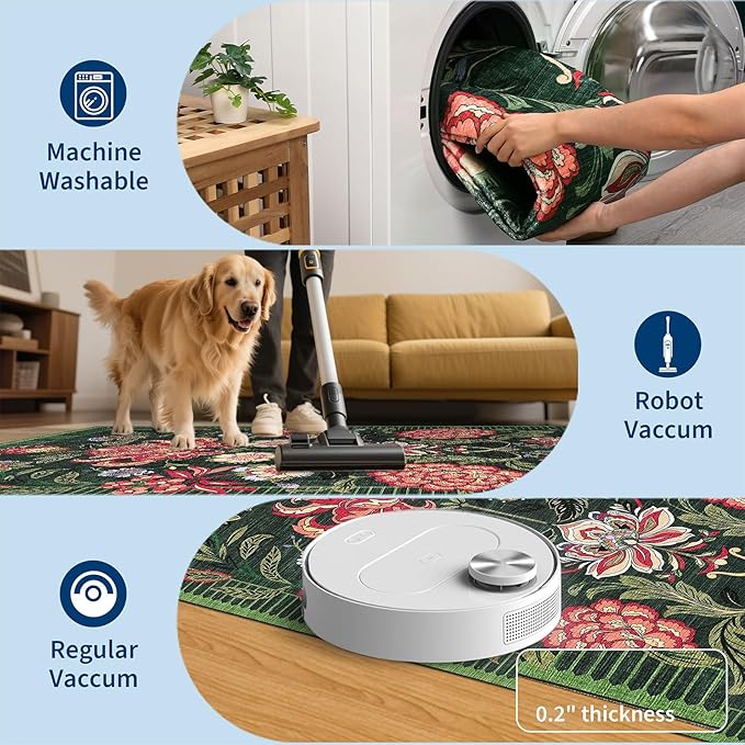 • 【floral Botanical Design】Inspired by floral fabrics, this botanical design features vivid, mirrored big floral motifs that attract the sweetest hummingbirds in a garden-like setting. Petals in bright yellow, lavender, pink, and red bloom beautifully against diffrent background. Water-resistant, stain-resistant, and machine-washable. Rug colors may vary slightly according to your device and the lighting in your space