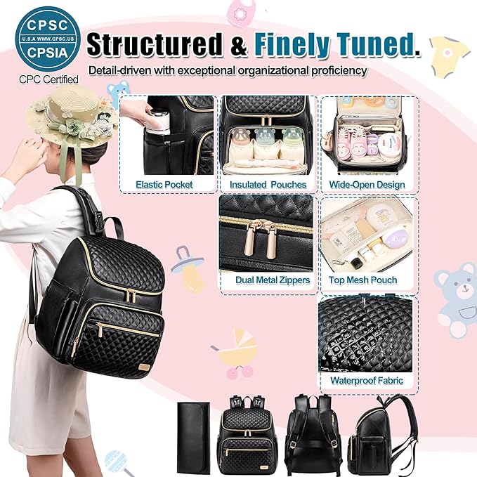 • 【Durable Build & Stylish baby bag】Baby diaper bag/ pañaleras para bebe With a sleek quilted design and gold-tone zippers, toddler diaper bag blends fashion and function. The high-quality faux leather diaper bag exterior resists wear, while the waterproof nylon interior protects contents. Available in multiple colors, it’s a diaper bag essentials for moms who want practicality without sacrificing style.