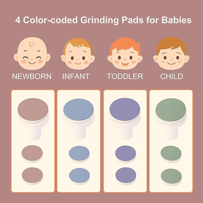 • Full Family Nail Care Kit – Fansidi infant nail file comes with 4 color-coded grinding pads for babies and 2 pads for adults, ranked neatly in the travel case. Additionally, 4 extra age-specific grinding heads + 8 soft sandpapers as a bonus are included in the color box, suitable for gentle filing from newborns to adults, saving future replacement costs.
