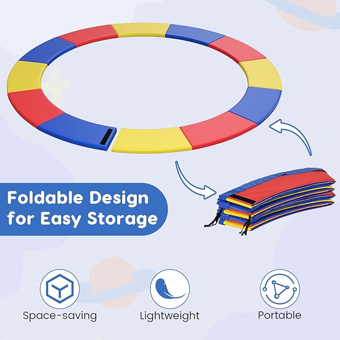 • [Foldable Design]: Thanks to the folding design, this trampoline safety pad is easy to store after use without taking up much space. Meanwhile, the lightweight and portable design allows you to easily carry it to your destination.