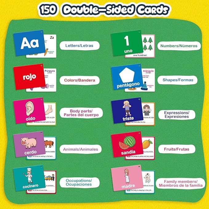 • Spanish Flash Cards: Featuring 150 double-sided flash cards and 10 bright rings, this cognitive flashcard set helps toddlers develop foundational skills. It covers key learning topics including letters, numbers, shapes, colors, animals, occupations, first words, body parts, and different fruits.