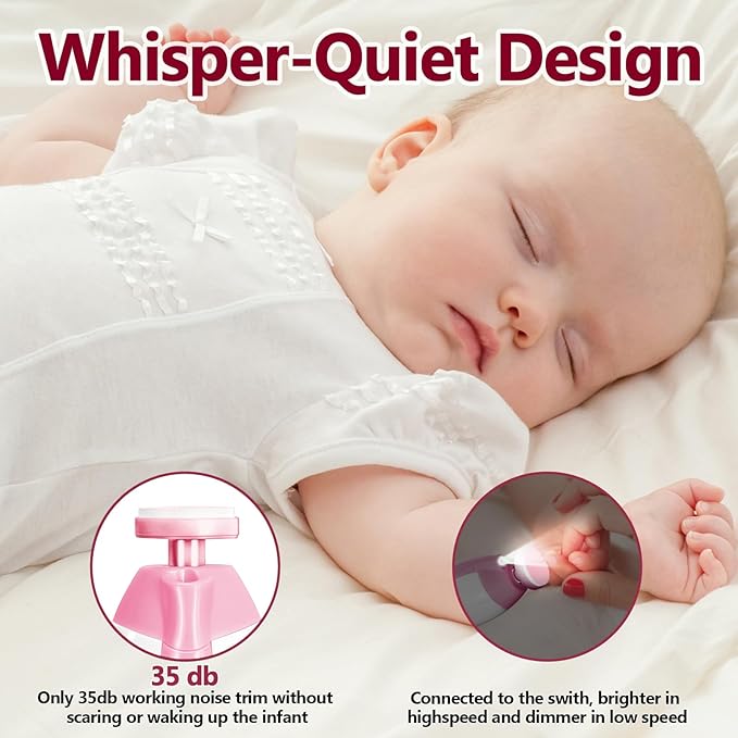 • Low Noise – The Baby electric nail trimmer is equipped with a whisper-quiet design. Only 35dB operating sound. You can file nails even as the baby sleeps, without causing any disturbance. You can use it in the dark at night.