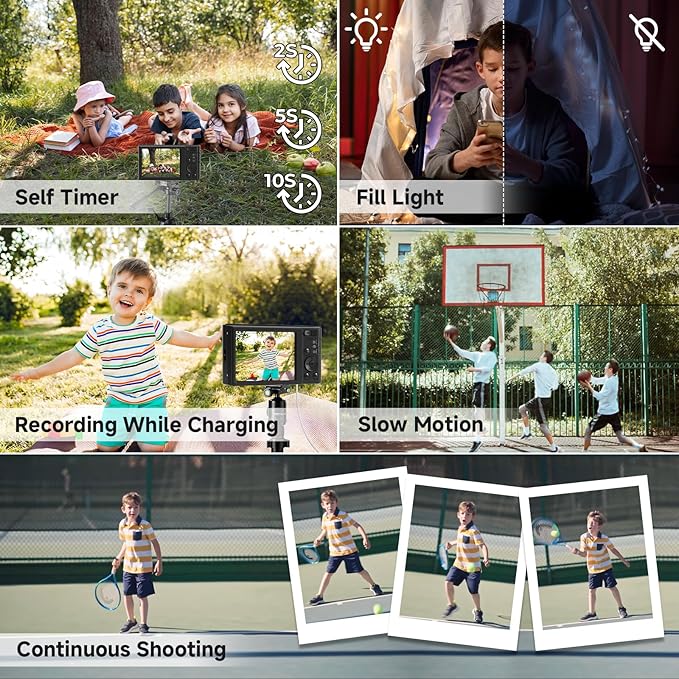 • 【16X Digital Zoom & Multifunctional】This digital camera for teens features a 16X digital zoom, easily adjustable with the W/T button. Simply press the shutter halfway for sharp, vivid images, and use the zoom to reach distant landscapes. Our digital camera built in 3 flash bulbs make the illumination brighter, helping you take clear photos even in low light. It also features self-timer, continuous shooting, fill light, time-lapse, slow motion, filters, date stamp, and scene modes, making it versatile for indoor and outdoor use.