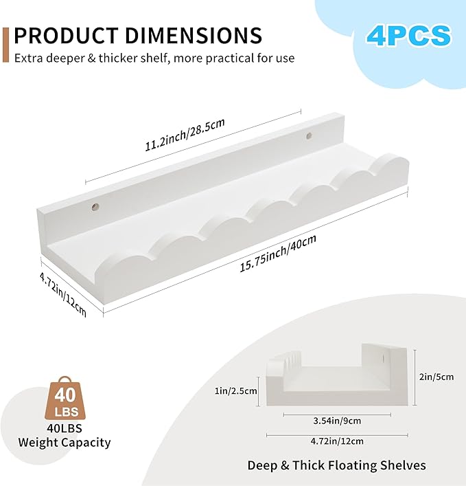• 【🏡Stylish Scalloped Design】 This scalloped floating shelves has a scalloped rounded front with smooth rounded corners and a minimalist design that is child friendly to use while adding a touch of sophistication to any room. Perfect for organizing bookshelf, toys and school materials, this nursery book shelves can also be used as children's room décor to add a cute and fun element to their room