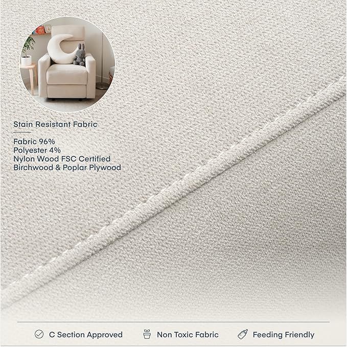 • SPILL-PROOF FABRIC & SUPERIOR CONSTRUCTION: Stain resistant and liquid repellent Live-Smart️ materials. Built with a birchwood and poplar plywood frame and offers extra padded cushions and a warranty on all moving parts, ensuring that the Glider stands the test of time and can grow with your family.