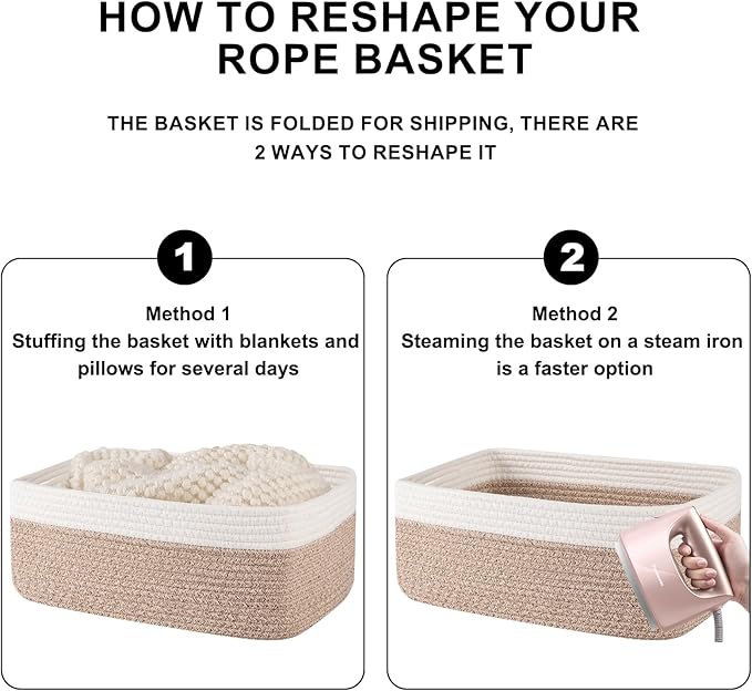 • Note: OIASKET gift baskets arrive folded. Upon receiving the basket, we recommend you first stuff the basket with clothes or towels to regain its shape. for quicker shaping, conside using a steam iron. Washable:These organizer baskets can be washed by hand or machine with gentle detergent