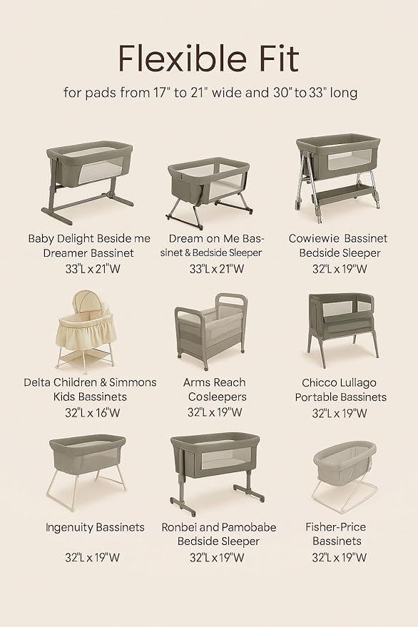 • Secure 33×20 fit with deep pocket: Designed for 33×20 inch bedside sleeper pads with a 4" deep pocket and full elastic hem. The snug fit stays flat without bunching or shifting, giving your baby a safe and stable surface to rest, roll, and stretch freely.