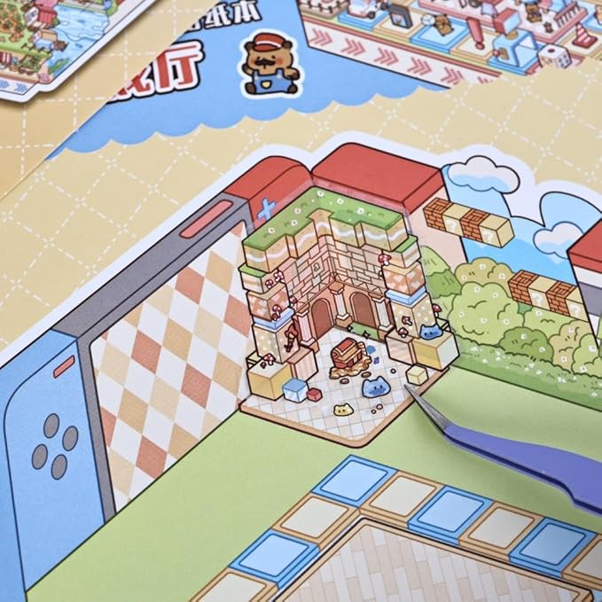 • 6 LARGE VARIOUS SCENES: The sticker set includes 6 sticker sets, 6 background boards, and a tweezer. Scenes feature a Dream Circus, Arcade, Chocolate Factory, Dream Clothing Store, Magic House Town, and Strawberry Workshop. Mix and match for endless DIY 3D house creations!