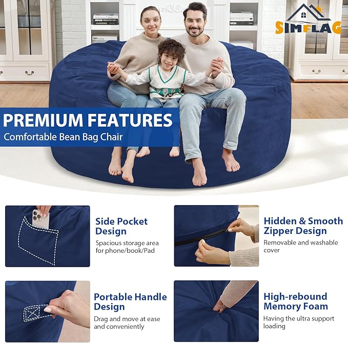 • CONVENIENT DESIGN: SIMFLAG bean bag sofa design with 4 thoughtful details, firstly, a pull-tab makes the bean bag chair easy to move around and manipulate. Second, an inter linner can contains the bean bag and allows you to wash the outside cover without spilling the beans. Third, a medium-sized pocket for your stuff. Fourth, a hidden zipper can prevent scratches to a people's delicate skin.