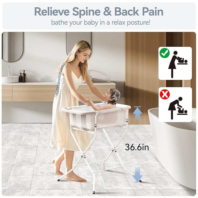 • 【Save Your Spine & Back】Engineered with ergonomics height, this baby bathtub with stand eliminates 90% of spinal & back strain caused by floor kneeling. Adapts to 150-200cm parents. No more numb legs or aching backs after bath time! The drain hole on the bottom can empty the water easily without bending over.
