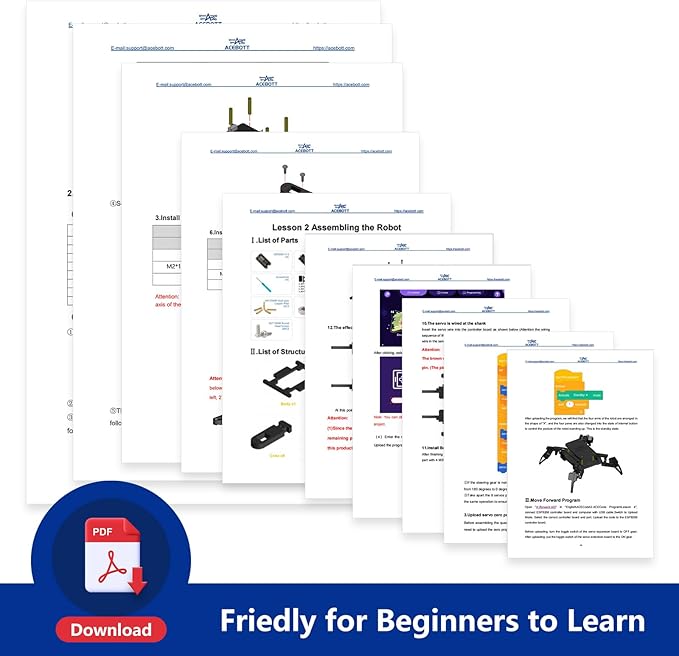 • Easy to Assemble - Using unified model screw splicing, installation and use are a breeze. A PDF tutorial with illustrations is considerately prepared for you, which teaches you to build your quadruped robot step by step. Structure building can exercise children's hands-on ability and cultivate children's interests and hobbies.