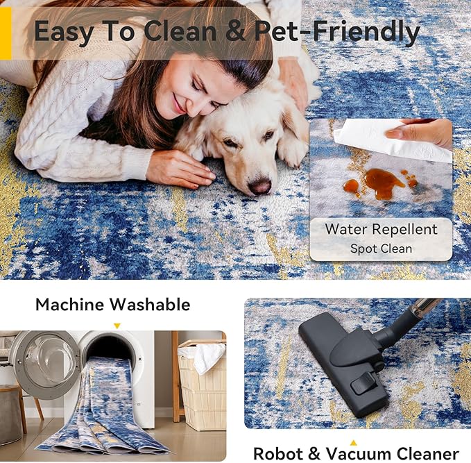 • Tides Series – Effortless style that flows with your life.This modern machine-washable non-slip rug features reinforced edges and a low-pile design that resists dirt. Its water-repellent surface makes spills easy to clean - liquids bead up for quick wiping. Simply machine wash in cold water (no bleach) to refresh. The non-slip backing keeps it securely in place. A perfect blend of function and contemporary design for active homes.