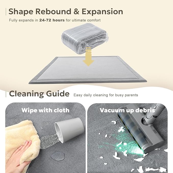 • EASY DAILY CARE: For everyday care, simply pat the surface to remove dust or use a vacuum with a soft brush attachment, gently following the velvet grain. It's an easy routine that helps keep your little one's world soft, smooth, and ready for play. To ensure safe transport, this baby play mat arrives vacuum-sealed, please allow 24 to 72 hours for the thick play mat for baby to fully expand to its original, cloud-like thickness