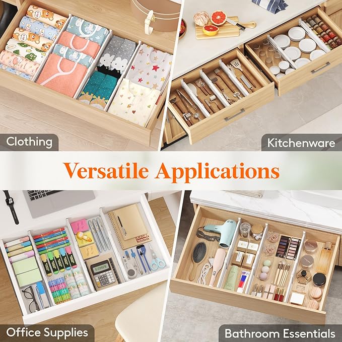 • Space Saving Design: With a thickness of only 0.4 inches (0.9 cm), this drawer separator maximizes your storage. Place it vertically or horizontally to create personalized drawer storage, ideal for organizing clothes, kitchenware, office supplies, toiletries, and cosmetics