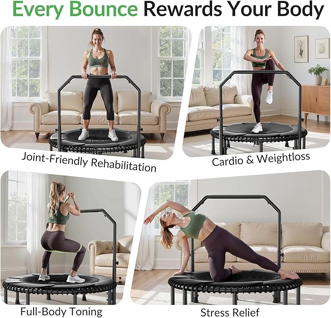 • 4-level Adjustable Handle: The fitness trampoline equipment with a 4-level height adjustable handlebar raged from 2'6" to 3'5" (on the mat), Jump with confidence