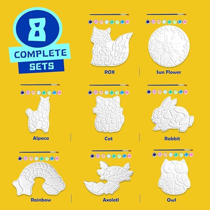 • 8 Unique Plaster Mosaic Designs Used for Creative Art Projects: This stepping stone painting 7 year old arts and craft girls kit for kids comes with 8 detailed and fun plaster designs, including Sun Flower, Rabbit, Rainbow, Axolotl, Fox, Cat, Dog, Owl, Alpaca making it the perfect screen-free activity for kids. Ideal for creating kids’ hand-painted stepping stones that can be displayed indoors or outdoors