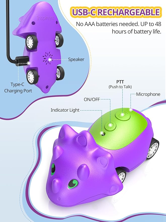 • [Rechargeable, Long-Lasting] : No more wasting money on endless AAA batteries! Each dino walkie-talkie toy car charges easily with the included USB-C cable and lasts up to 48 hours on a single charge, keeping the dino adventures going anytime, anywhere. Please Note: The included cables are designed for these dinosaur toys only and should not be replaced with other cords.