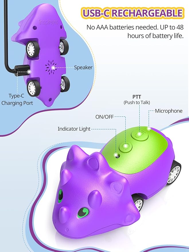• [Rechargeable, Long-Lasting] : No more wasting money on endless AAA batteries! Each dino walkie-talkie toy car charges easily with the included USB-C cable and lasts up to 48 hours on a single charge, keeping the dino adventures going anytime, anywhere. Please Note: The included cables are designed for these dinosaur toys only and should not be replaced with other cords.