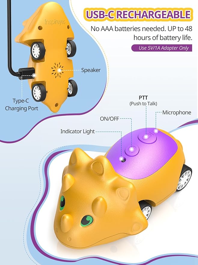 • [Rechargeable, Long-Lasting] : No more wasting money on endless AAA batteries! Each dino walkie-talkie toy car charges easily with the included USB-C cable and lasts up to 48 hours on a single charge, keeping the dino adventures going anytime, anywhere. Please Note: The included cables are designed for these dinosaur toys only and should not be replaced with other cords.
