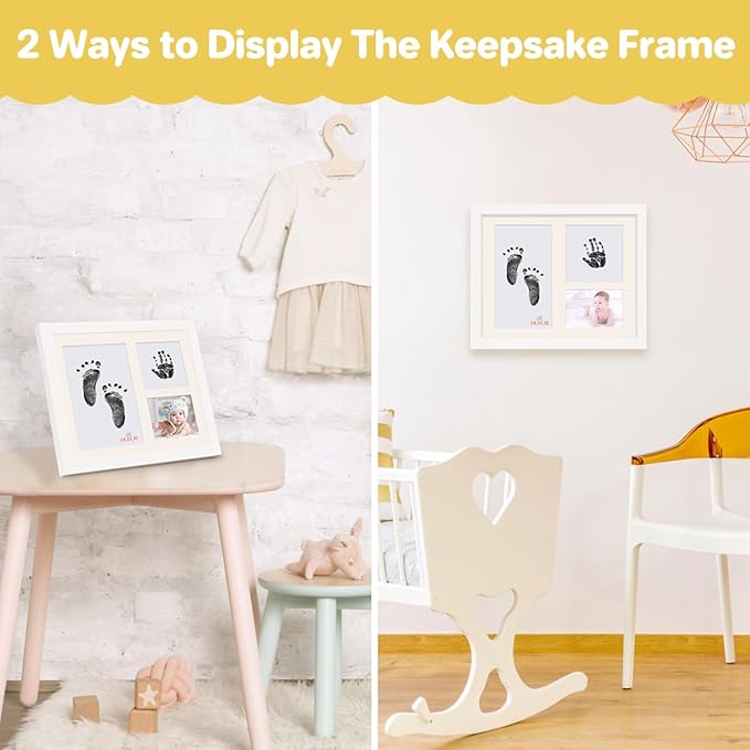 • Easily Create Lasting Memories: Capture your baby's precious moments with our baby hand and footprint kit. The kit includes three different-sized slots to accommodate handprints, footprints, and photos. Hang the finished newborn keepsake on the wall using the included damage-free nails, adding a personal touch to your home decor without leaving any marks.