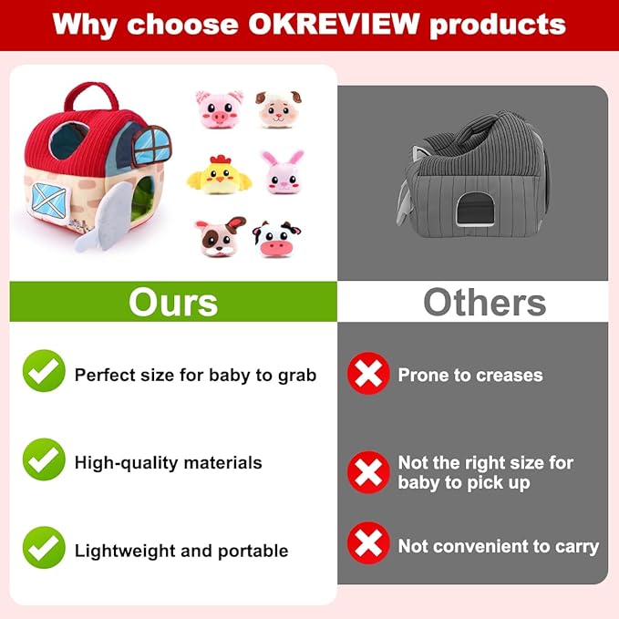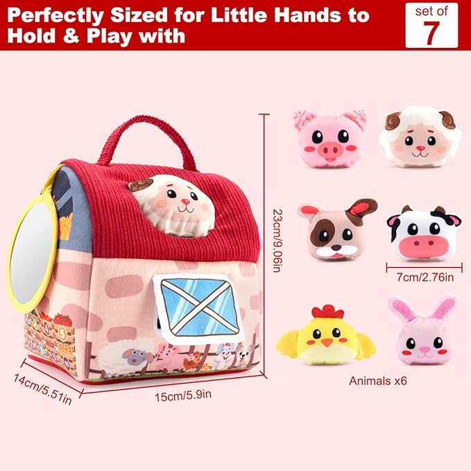 • Sensory Adventure: Specially designed for toys for 1 year old boy, this set invites little ones to explore the textures of farm animals, each filled with delightful rattles for unexpected surprises and endless joy. The satisfying crinkle sounds that accompany each gentle squeeze add a unique sensory experience, perfect for growing minds. The barn’s side mirror becomes a tool for self-discovery, promoting self-awareness and sparking moments of happiness. A wonderful addition to any collection of Montessori toys for 1 year old.