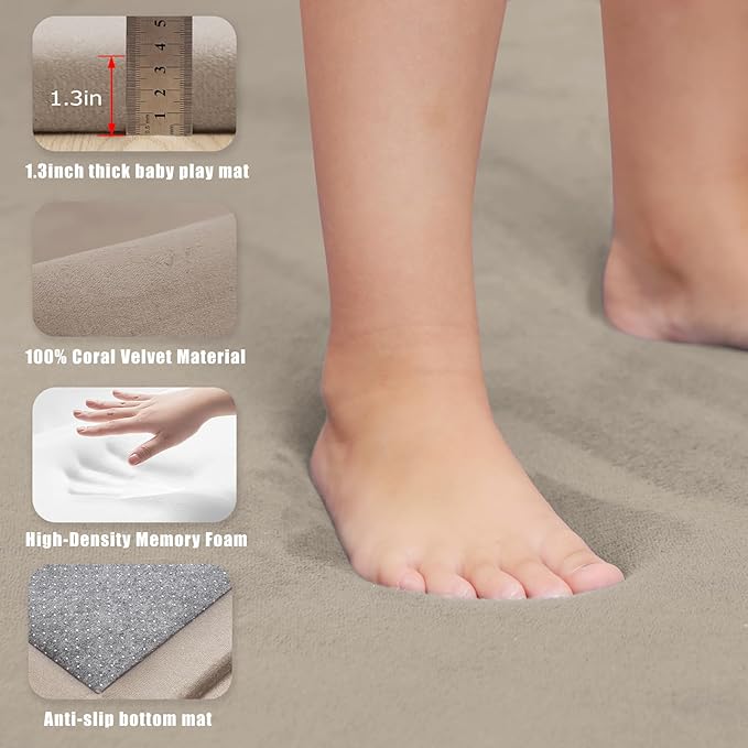 • SOFT TOUCH & CARING PROTECTION: Every exploration of the baby requires soft care. This baby play mat for floor is specially designed for the baby's delicate skin and play nature. The 1.3-inch thick memory foam filling gives the baby just the right support and a full sense of security. The surface is 100% coral fleece material, which does not shed or fall off.